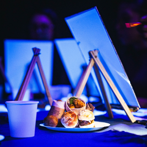 Tout : toile, pinceaux, peintures néon, lumière UV, peintre pro, mignardises & boissons. Un DJ est même de la parti
