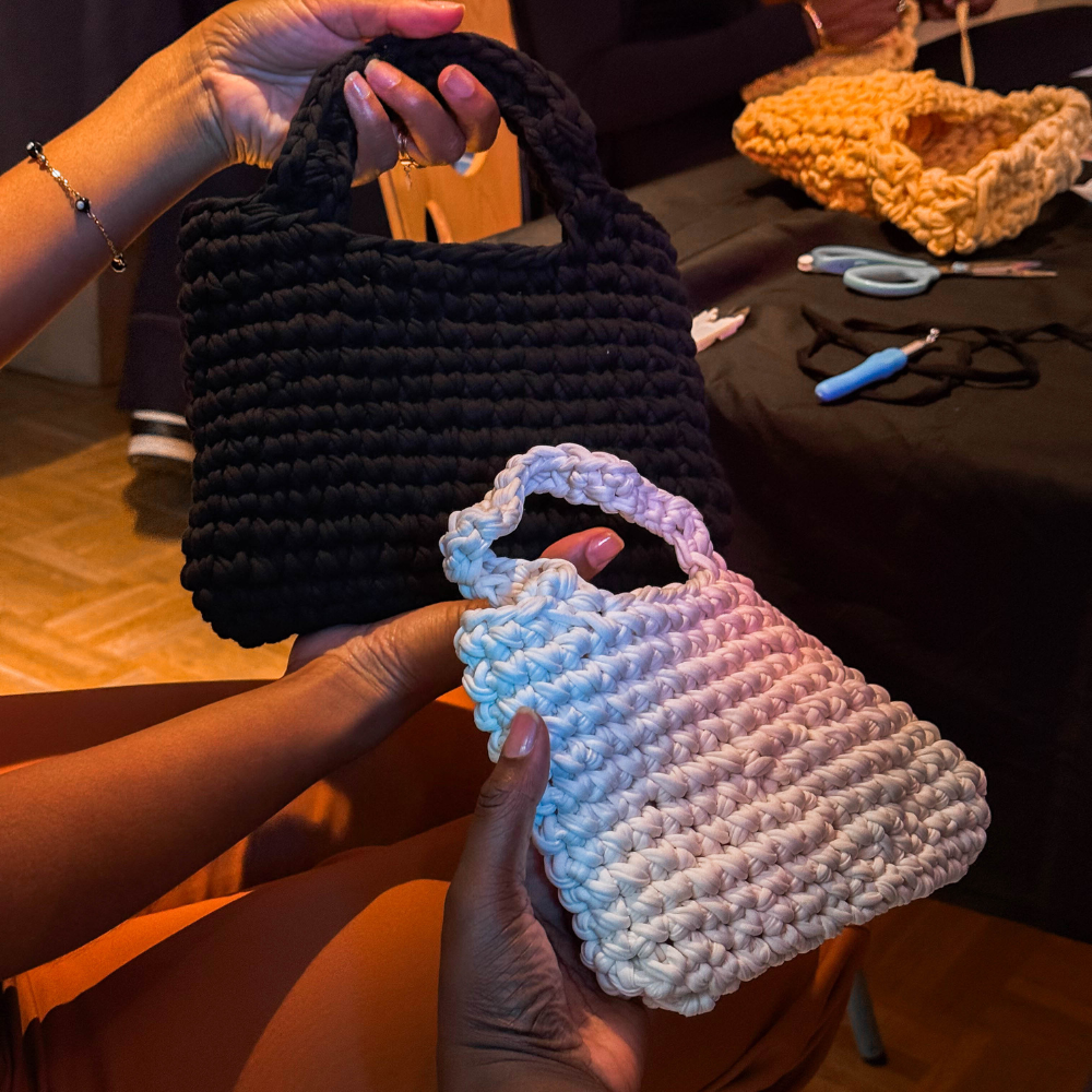 Un kit complet (pelote en coton, crochet, guide), 3 animatrices qualifiées, boissons & mignardises, et bien sûr votre sac fait main.